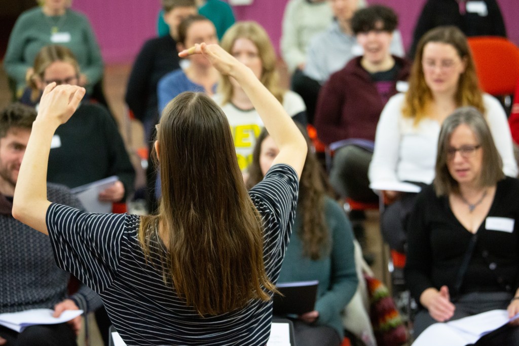 You can choose where to sit for the rehearsal: you’ll find our higher voices (sopranos) near the door, and lower (basses) at the far end. We do not assign seats based on gender or any other characteristic, and there are no auditions. If you’re not sure yet whether you’re a soprano, alto, tenor or bass, we suggest sitting somewhere in the middle to start with, and then you can figure out which parts feel most comfortable for you to sing.